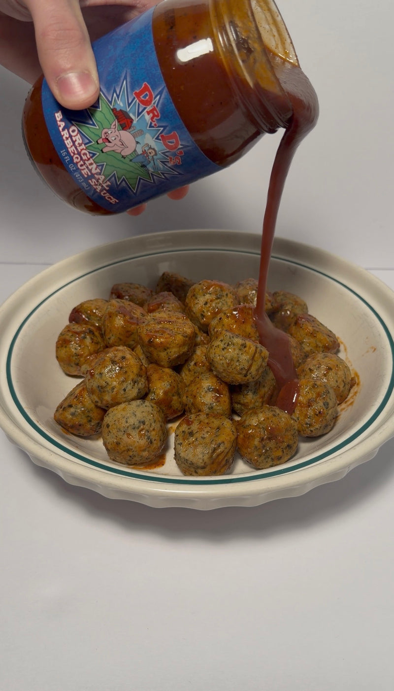 Once meatballs are heated through, drain the water and add 1/3 cup of Dr. D's Original Barbeque Sauce. Continue stirring while allowing the meatballs and sauce of head through.